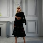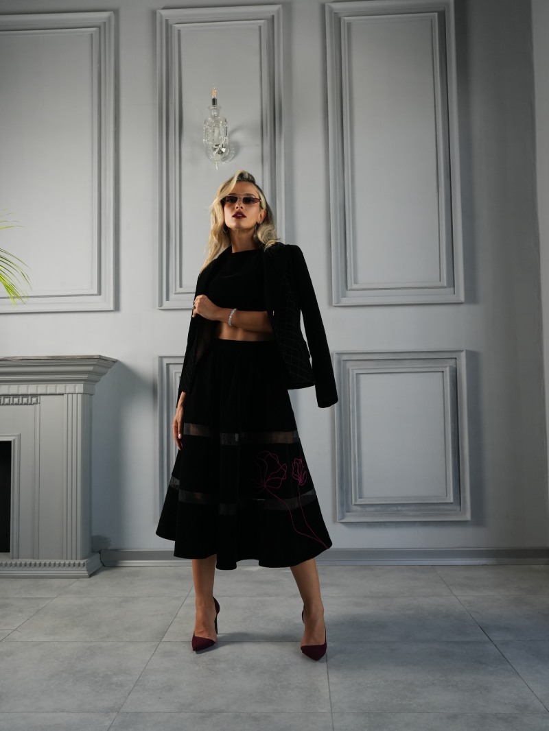 This 60 cm black checkered velvet jacket and 77 cm flared skirt are crafted from premium velvet and finished with hand embroidery.