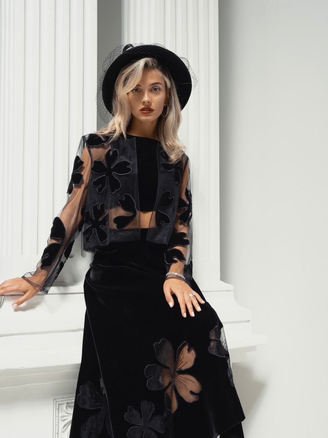 The Jacket cut at 45 cm, is crafted from the finest silk velvet, delicately embroidered by hand with soft, velvet-cut flowers. A light layer, yet rich in detail, brought to life in 32 hours of focused artistry.