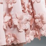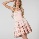The dress features intricate, hand-placed floral appliqués that evoke a sense of blossoming life. Each flower is adorned with sparkling beads, catching the light with every movement, just like fresh dewdrops on a petal. The subtle pleats on the skirt add to its ethereal charm, creating a silhouette that is both elegant and playful.