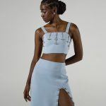 The cropped top features precise tailoring and crystal embellishments that sparkle like scattered stars, adding a touch of celestial charm. The flowing skirt, designed with a graceful slit adorned by handcrafted jewels, turns every step into a radiant display of movement and light.